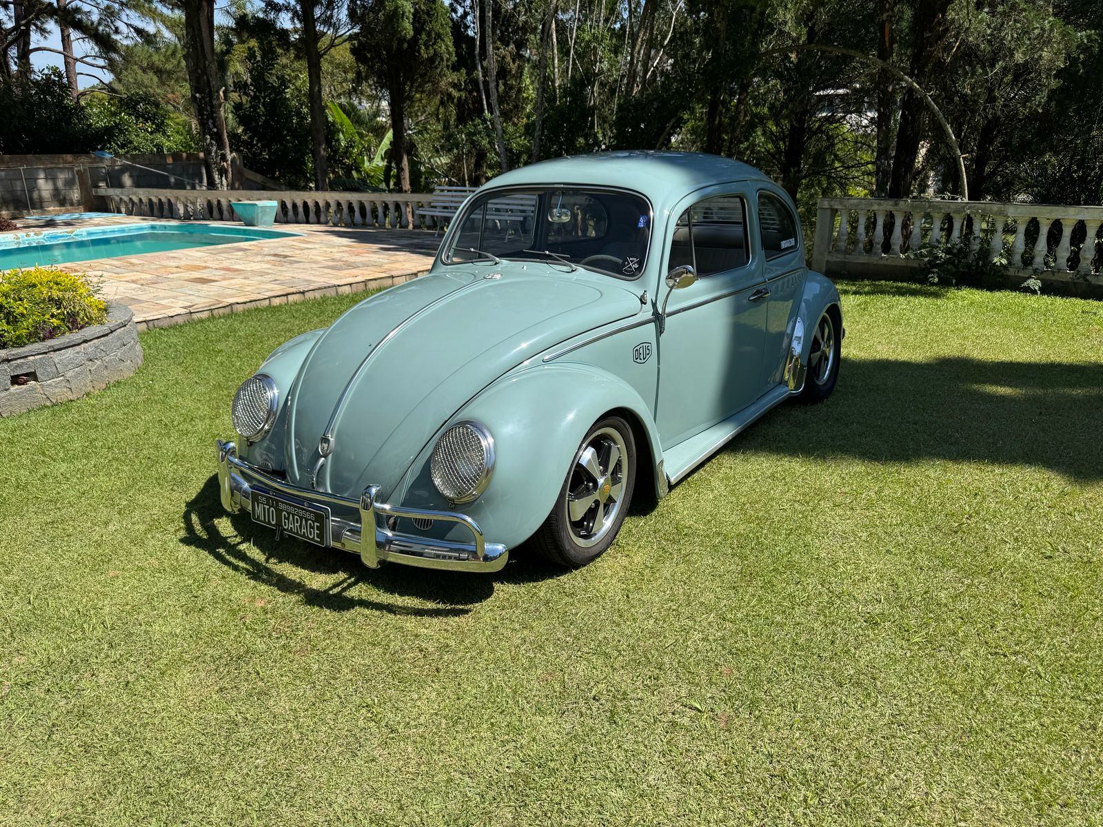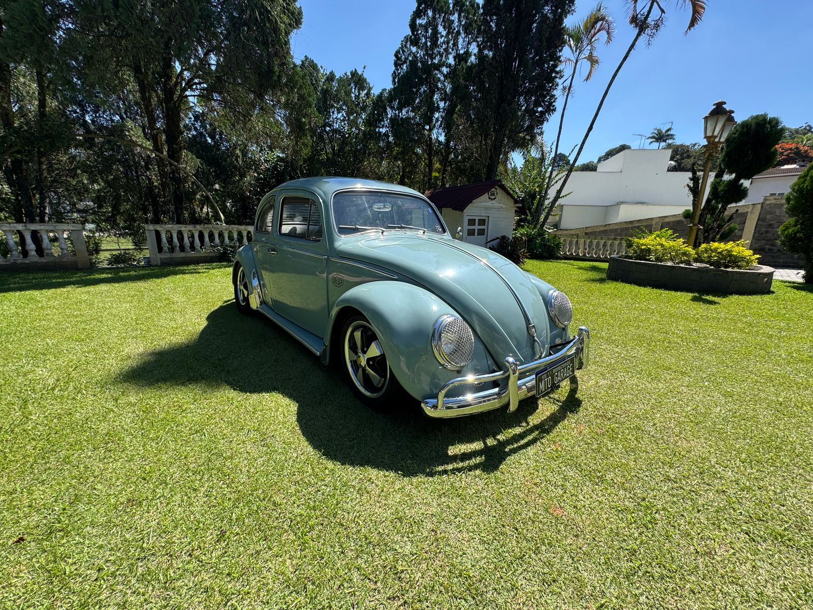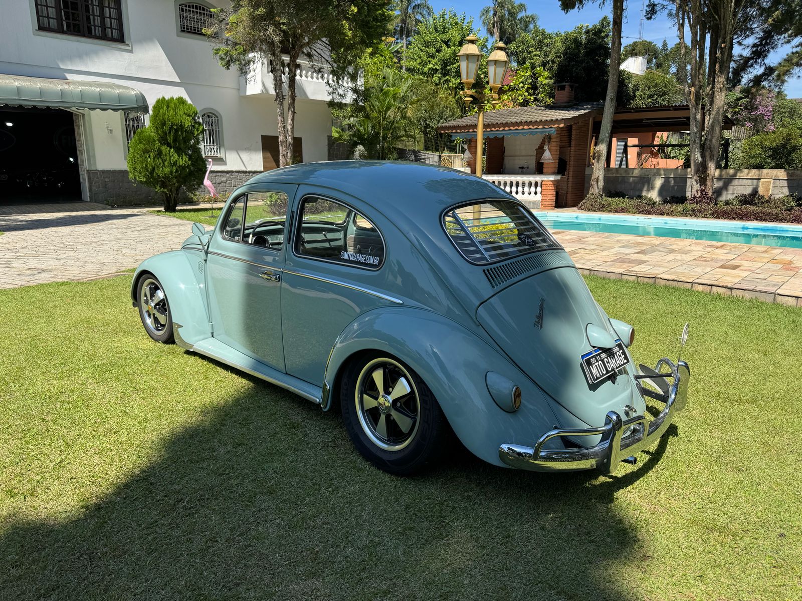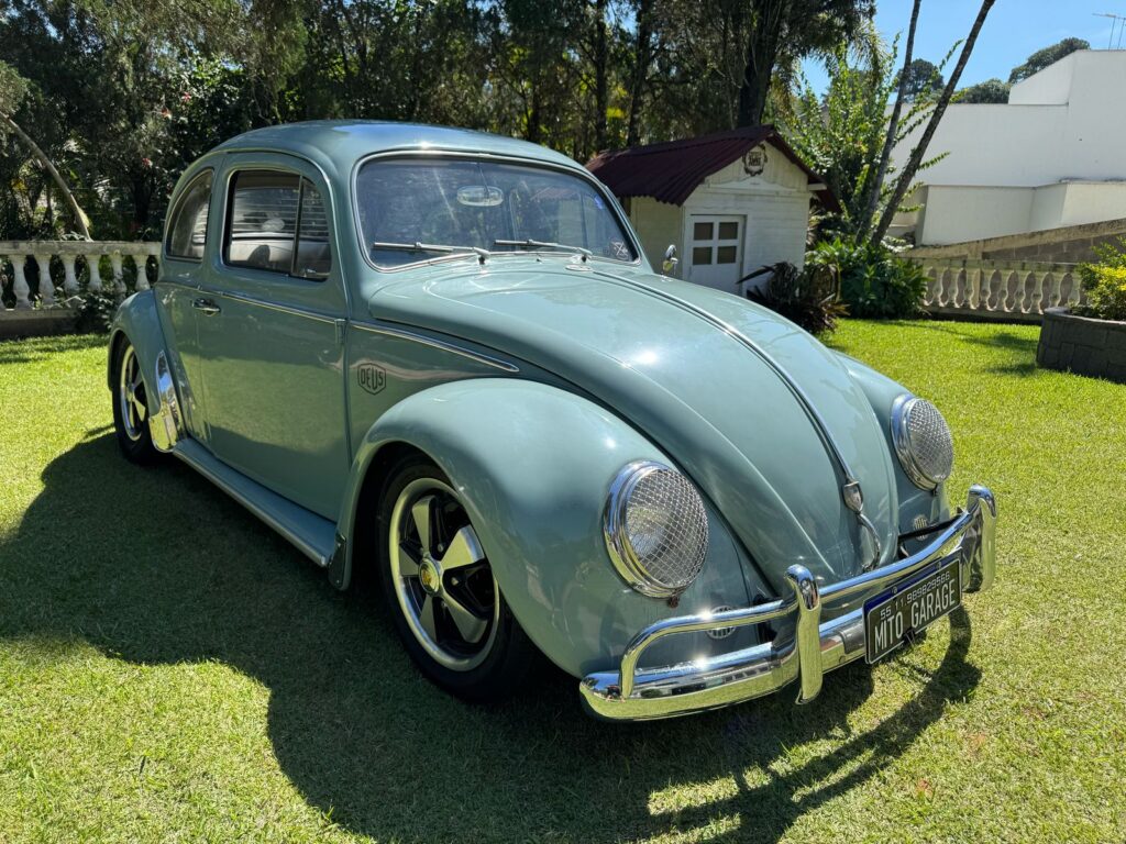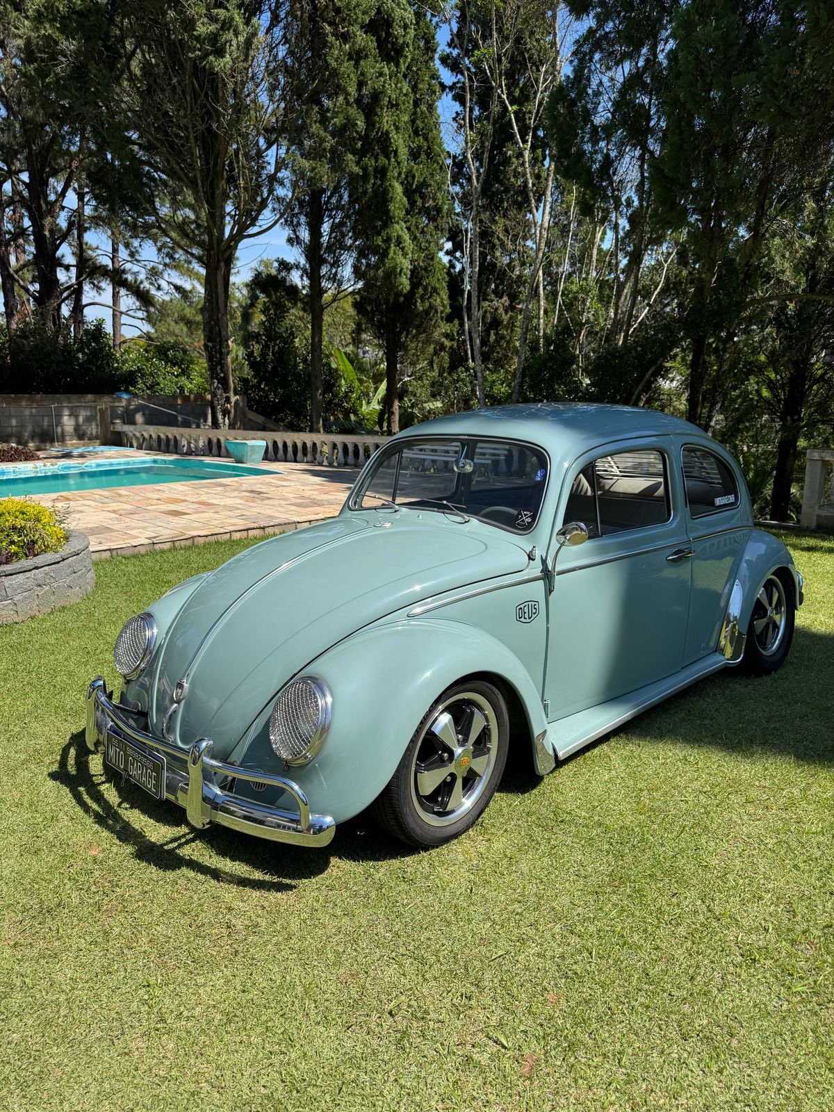 VW Fusca 1960, Azul Pastel, extremamente raro nos dias de hoje, possui setas bananinha de sinalização, jogo de Rodas Fuchs incluindo o estepe, Persianas, farol olho de boi, grades de farol de porsche importadas, parachoques cromados com batente e goleira bicudinha, nariz de bruxa, lanternas pequenas, saia H e frente com 4 Ts, braço suporte tampa do porta malas, tanque alto com régua graduada para medir o combustível, estribos na cor do carro, interior no padrão original com bancos caixotes em dois tons, mamadeira ou saco de bode como esguicho de água e motor 1200 no padrão original.