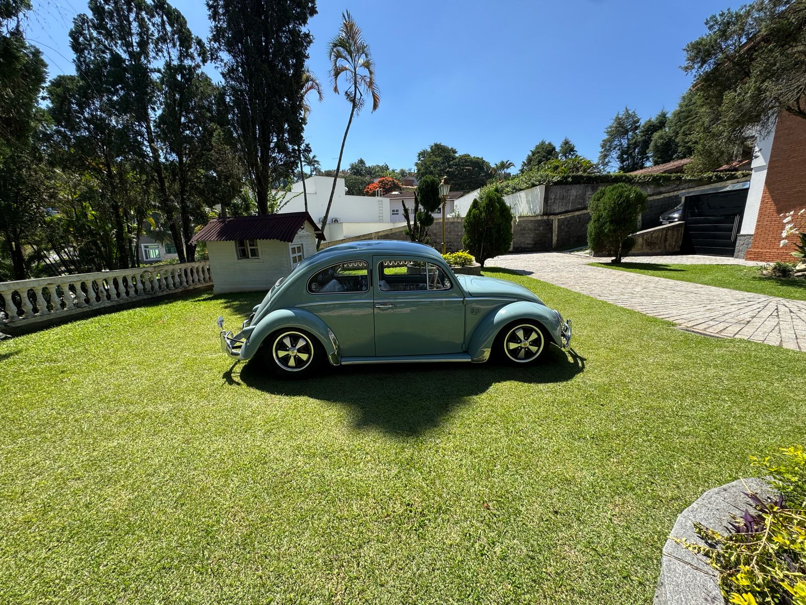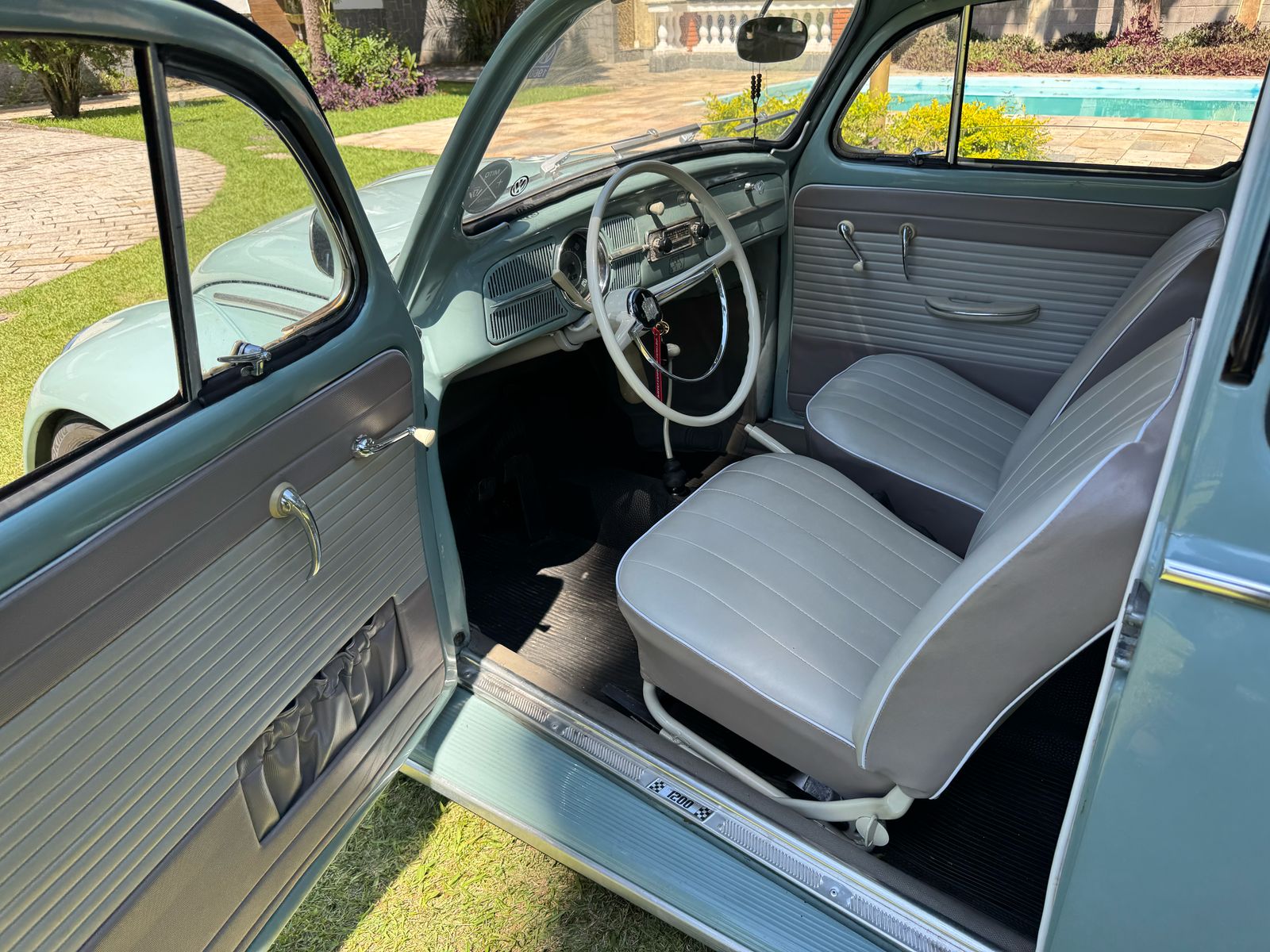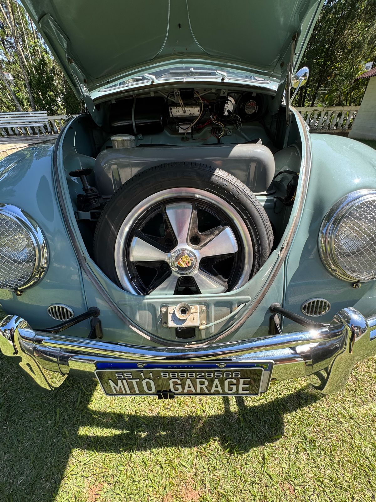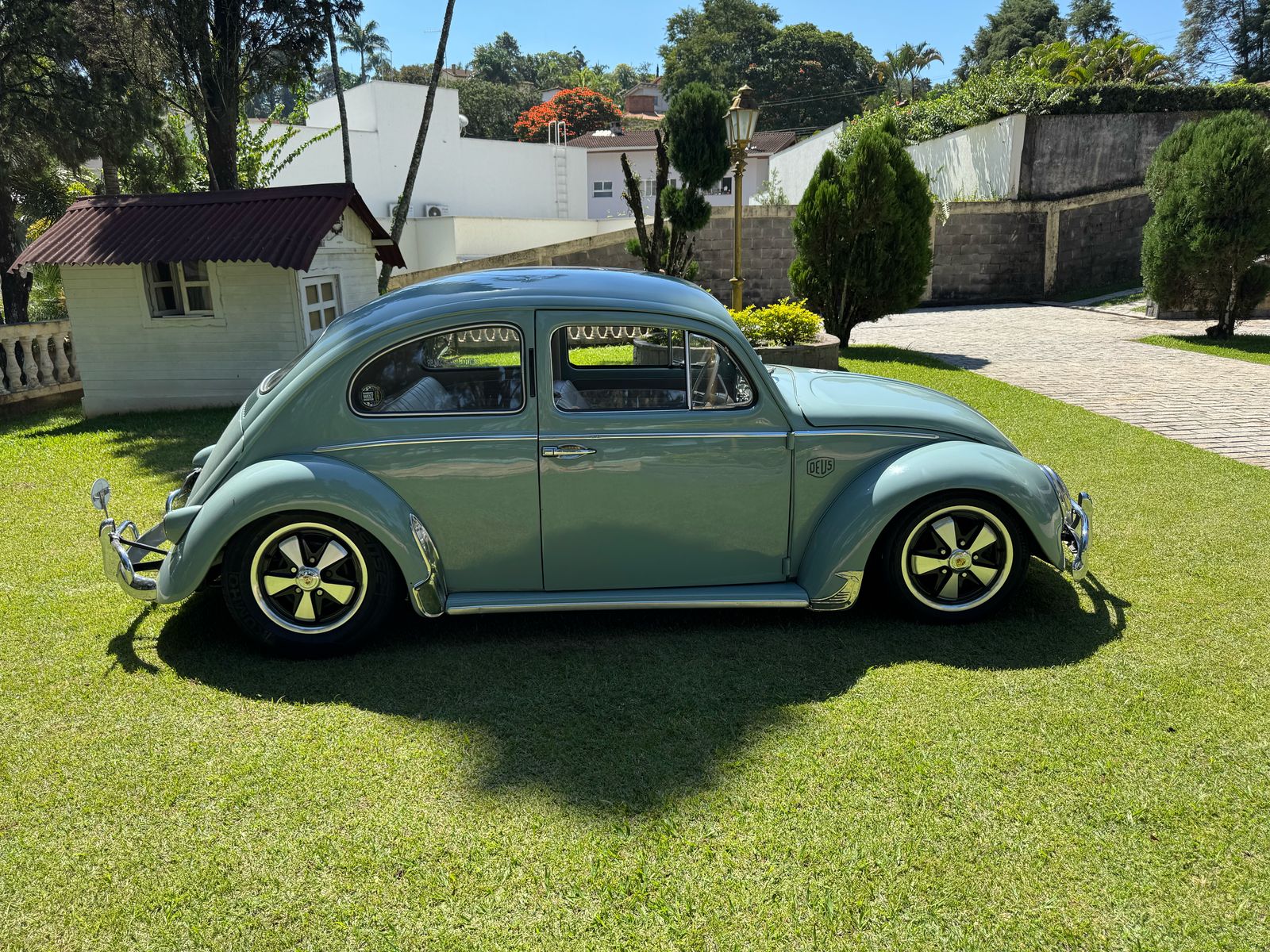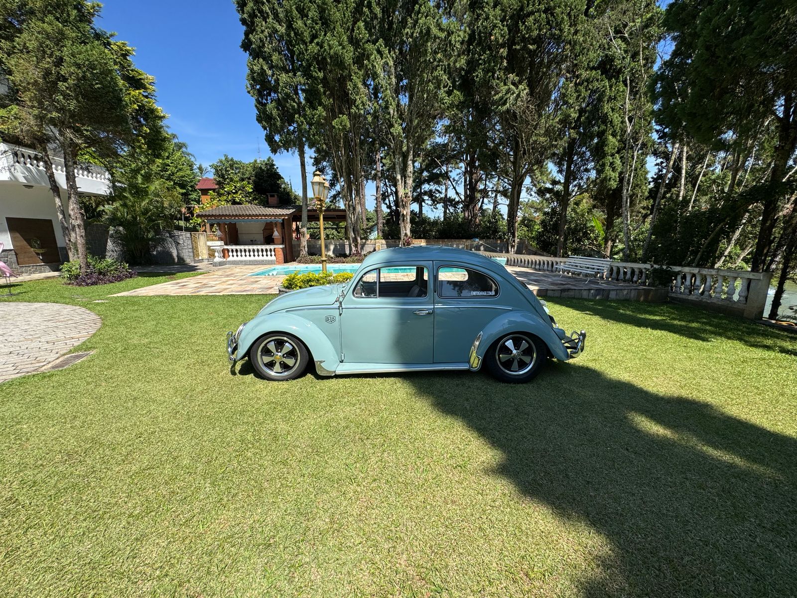 VW Fusca 1960, Azul Pastel, extremamente raro nos dias de hoje, possui setas bananinha de sinalização, jogo de Rodas Fuchs incluindo o estepe, Persianas, farol olho de boi, grades de farol de porsche importadas, parachoques cromados com batente e goleira bicudinha, nariz de bruxa, lanternas pequenas, saia H e frente com 4 Ts, braço suporte tampa do porta malas, tanque alto com régua graduada para medir o combustível, estribos na cor do carro, interior no padrão original com bancos caixotes em dois tons, mamadeira ou saco de bode como esguicho de água e motor 1200 no padrão original.