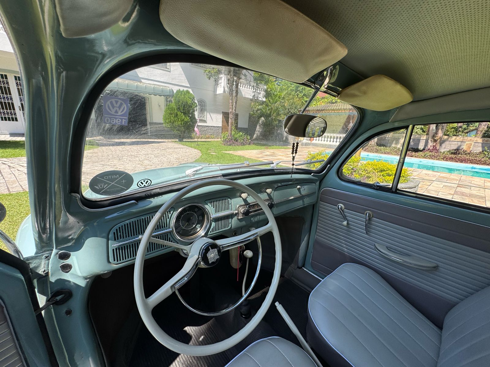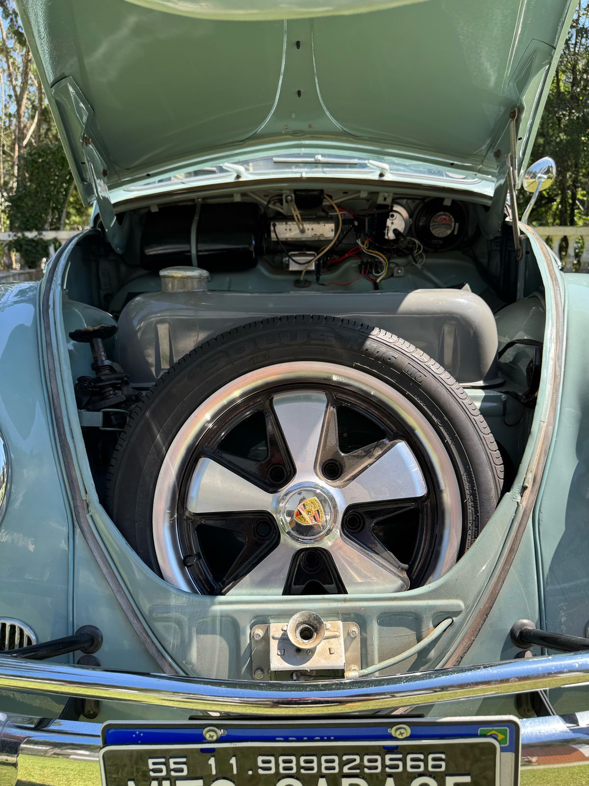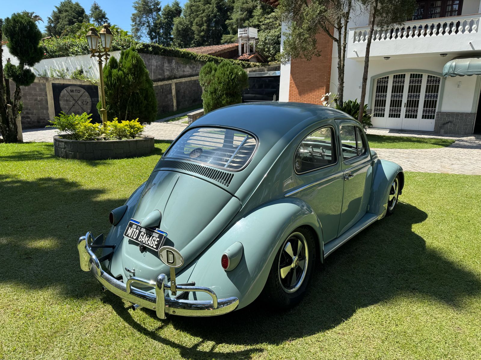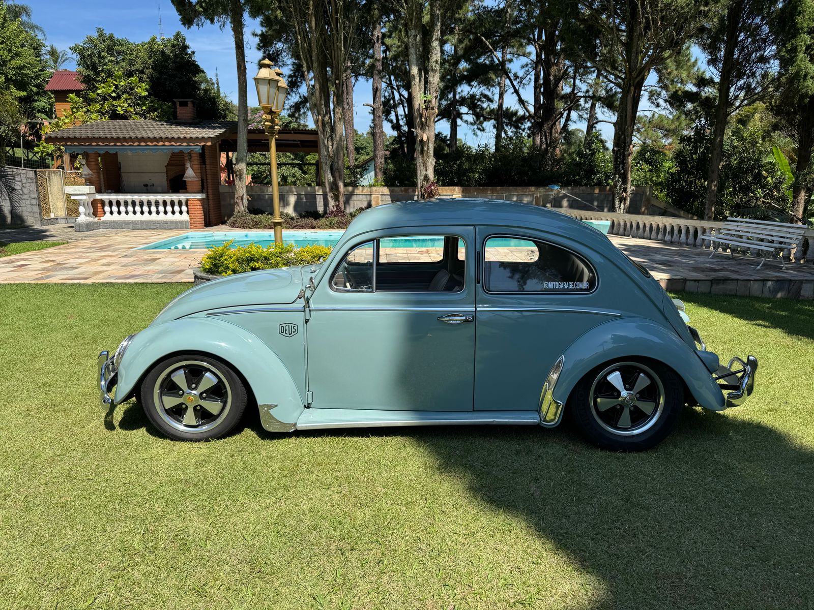 VW Fusca 1960, Azul Pastel, extremamente raro nos dias de hoje, possui setas bananinha de sinalização, jogo de Rodas Fuchs incluindo o estepe, Persianas, farol olho de boi, grades de farol de porsche importadas, parachoques cromados com batente e goleira bicudinha, nariz de bruxa, lanternas pequenas, saia H e frente com 4 Ts, braço suporte tampa do porta malas, tanque alto com régua graduada para medir o combustível, estribos na cor do carro, interior no padrão original com bancos caixotes em dois tons, mamadeira ou saco de bode como esguicho de água e motor 1200 no padrão original.