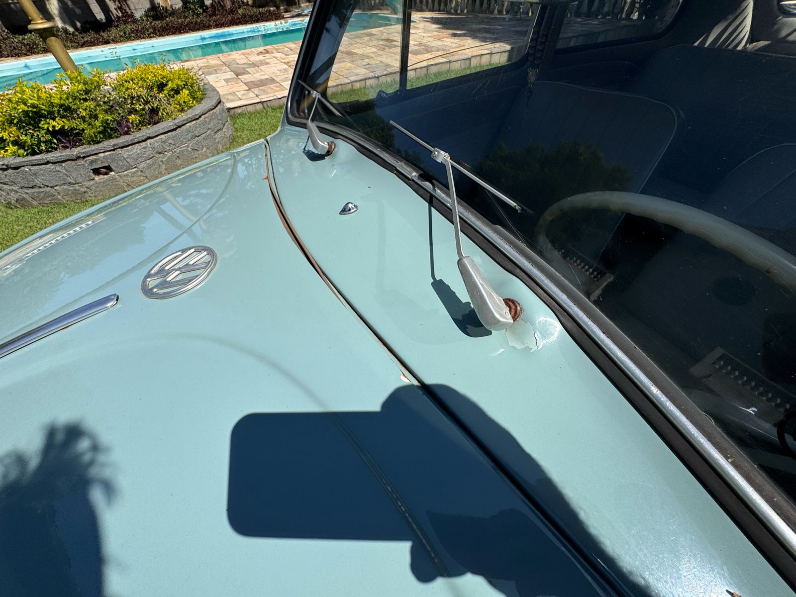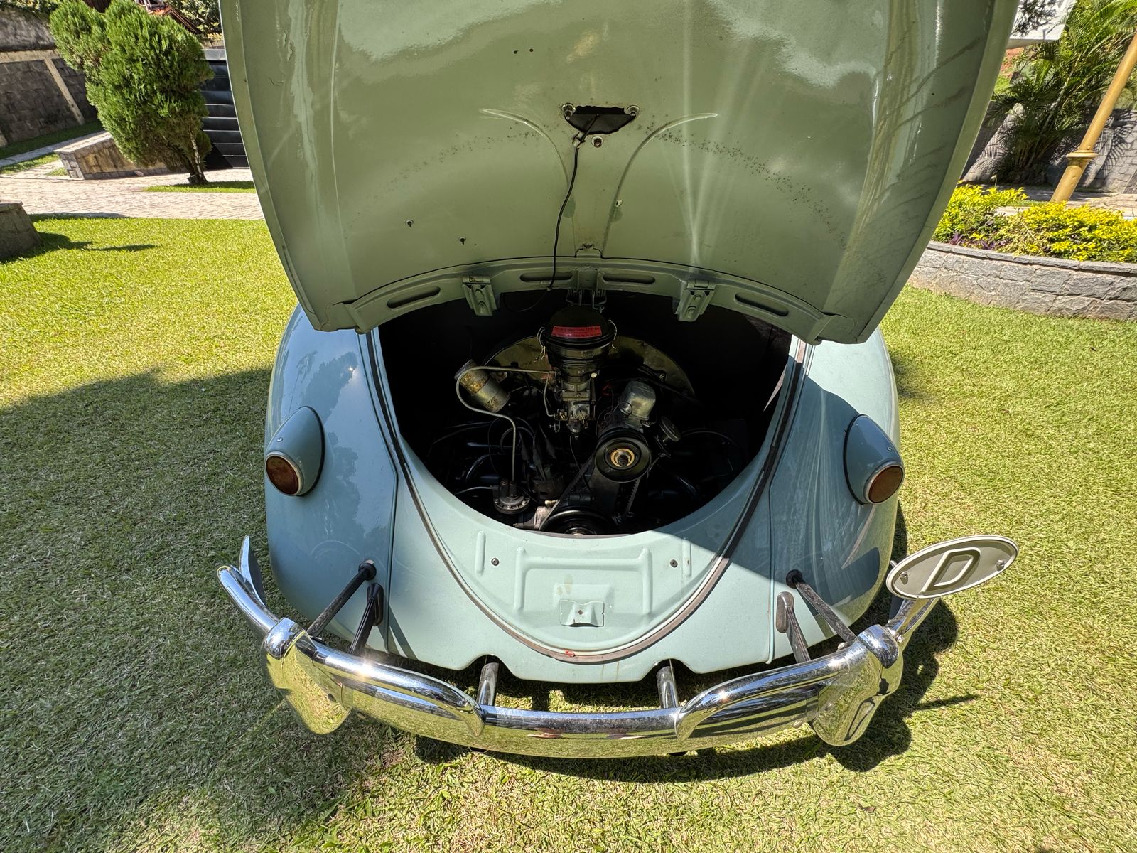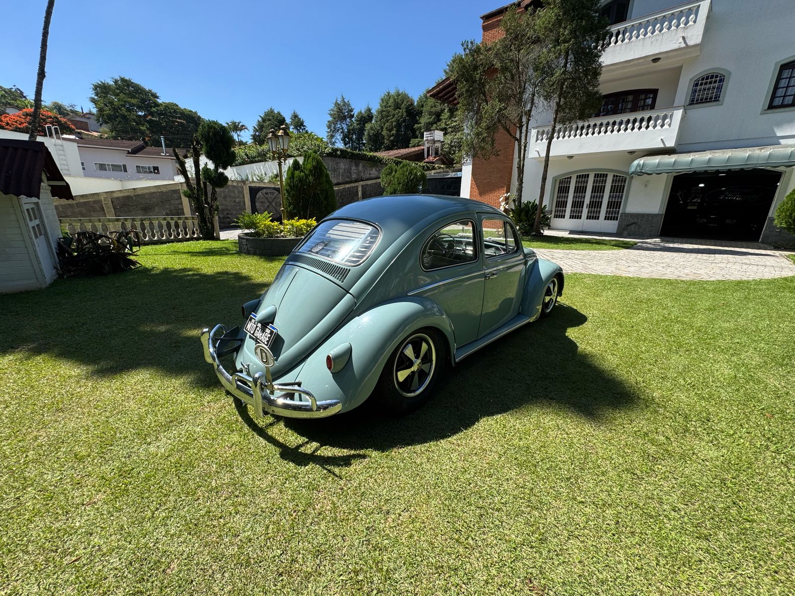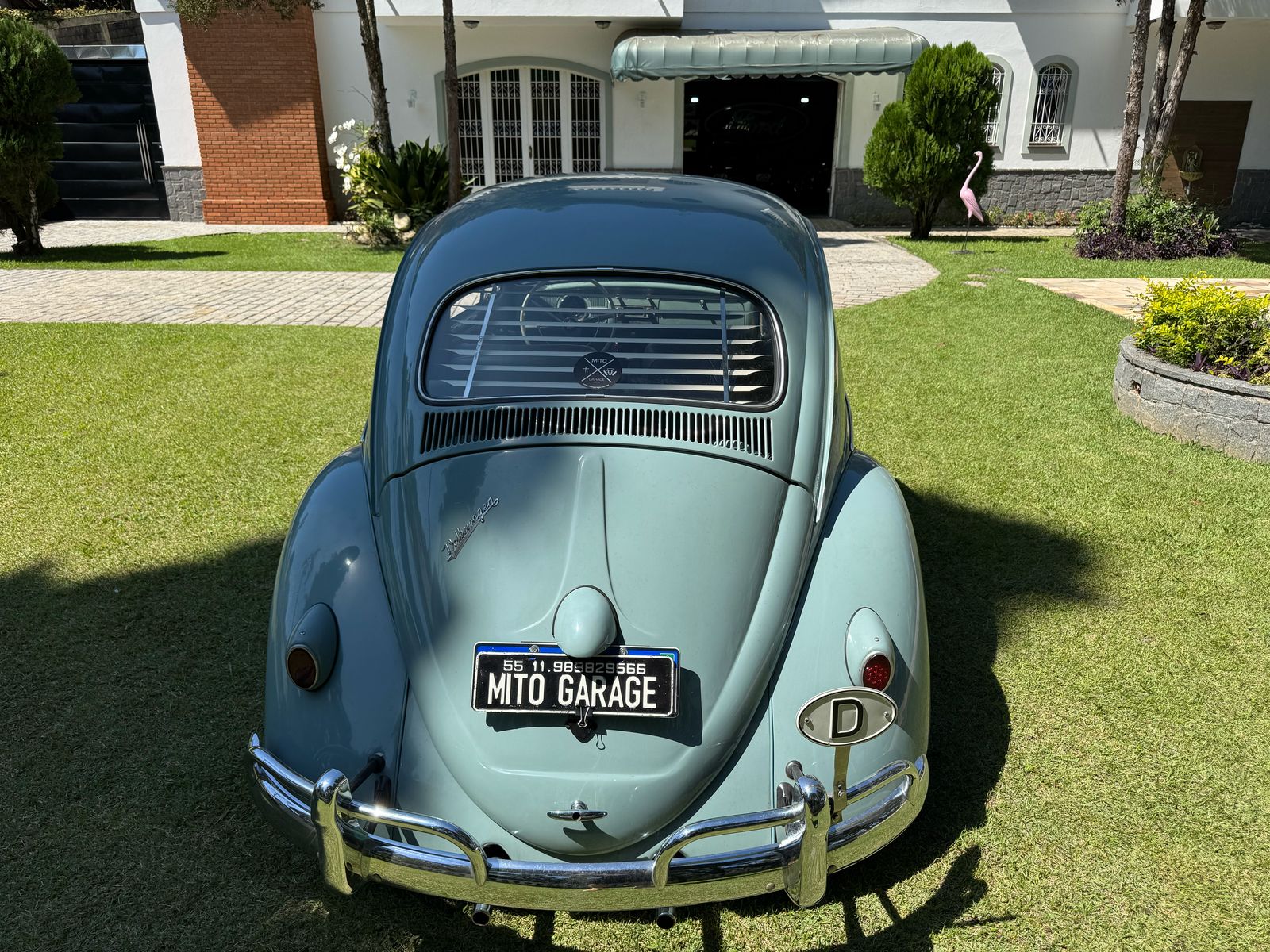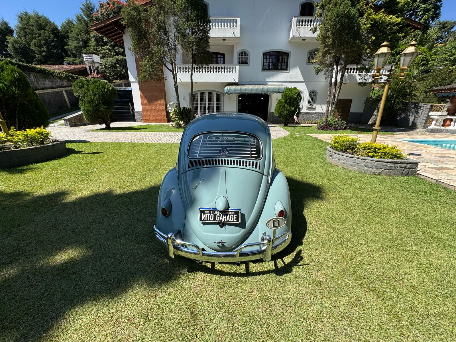 VW Fusca 1960, Azul Pastel, extremamente raro nos dias de hoje, possui setas bananinha de sinalização, jogo de Rodas Fuchs incluindo o estepe, Persianas, farol olho de boi, grades de farol de porsche importadas, parachoques cromados com batente e goleira bicudinha, nariz de bruxa, lanternas pequenas, saia H e frente com 4 Ts, braço suporte tampa do porta malas, tanque alto com régua graduada para medir o combustível, estribos na cor do carro, interior no padrão original com bancos caixotes em dois tons, mamadeira ou saco de bode como esguicho de água e motor 1200 no padrão original.