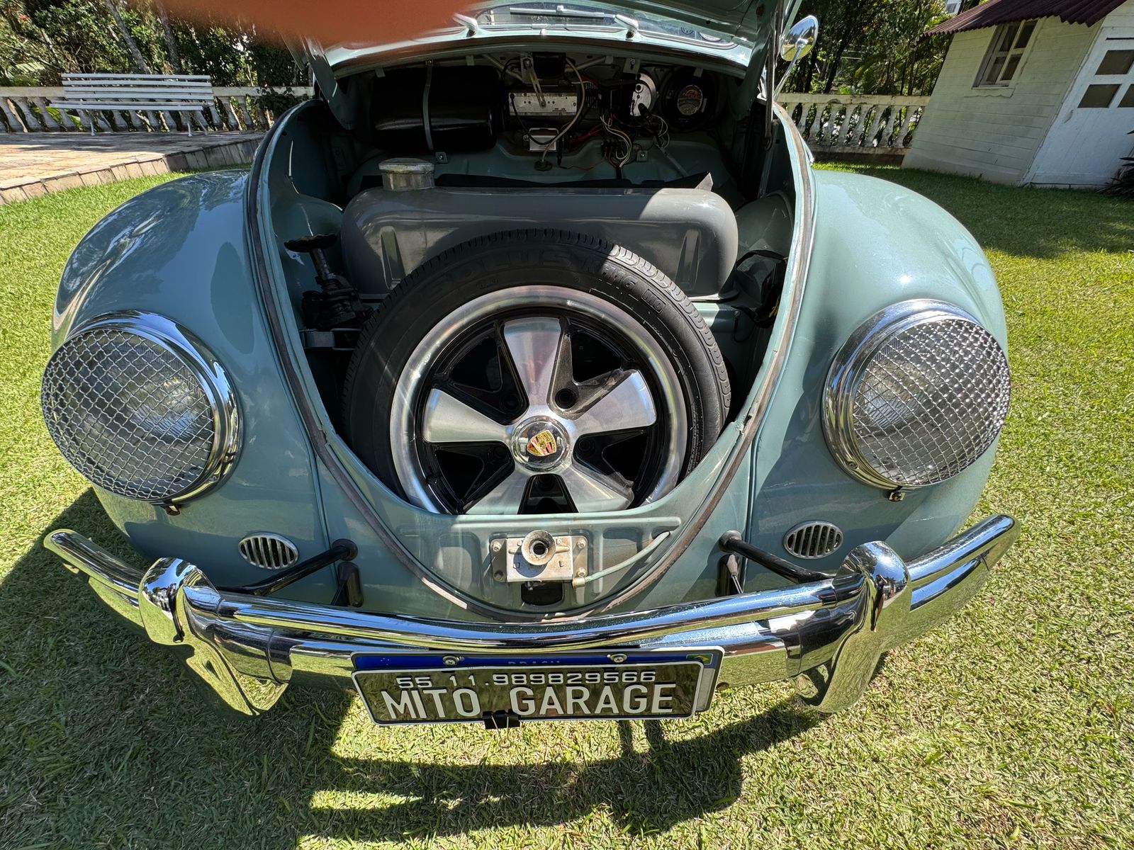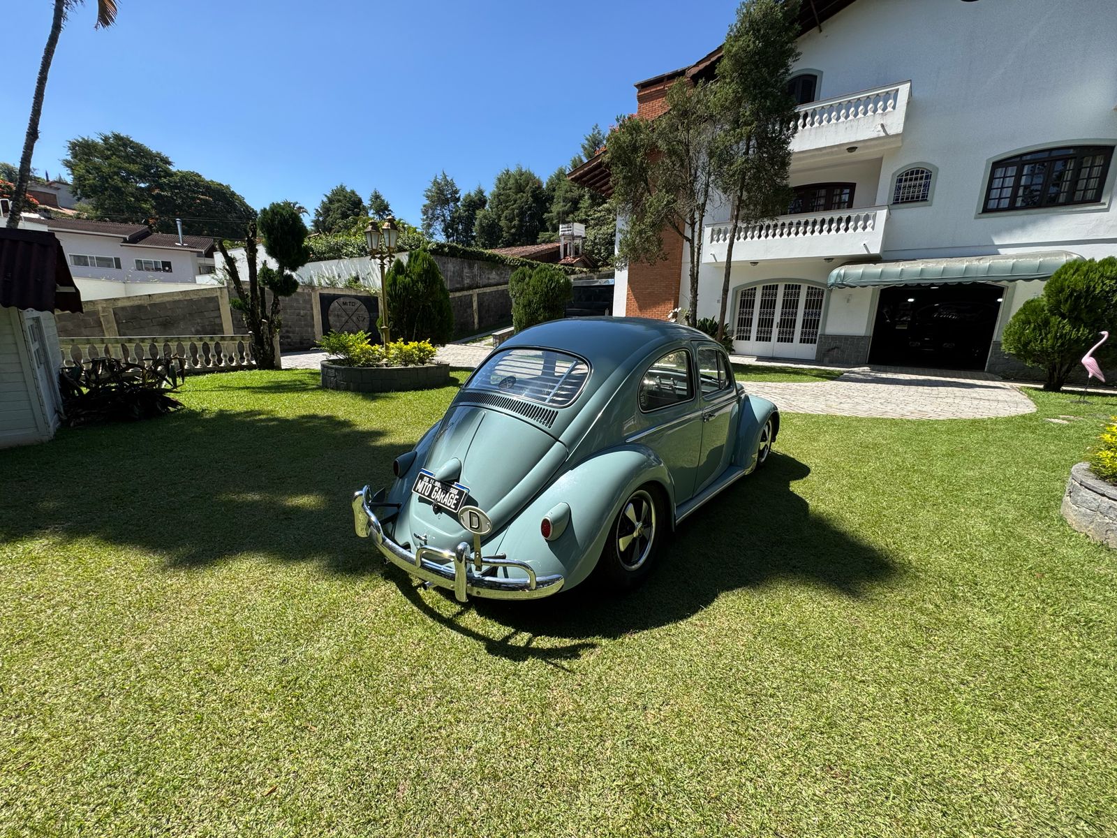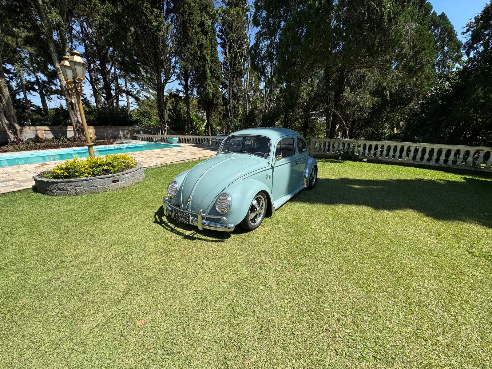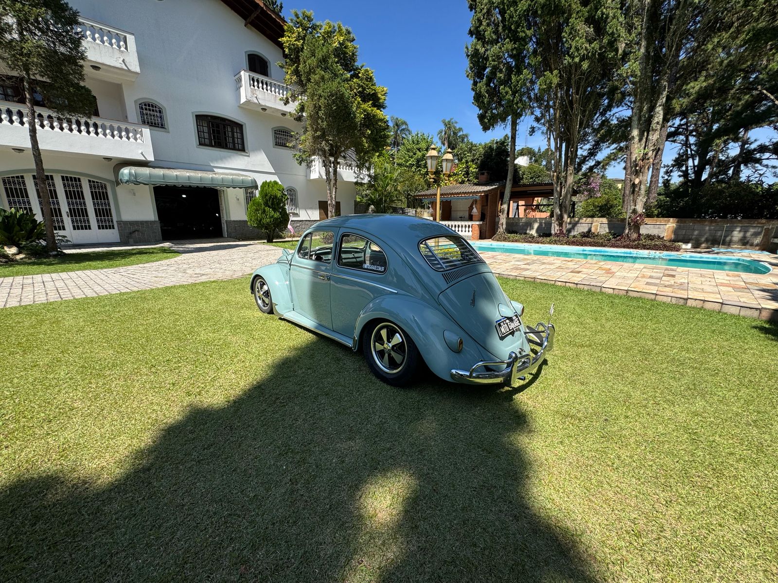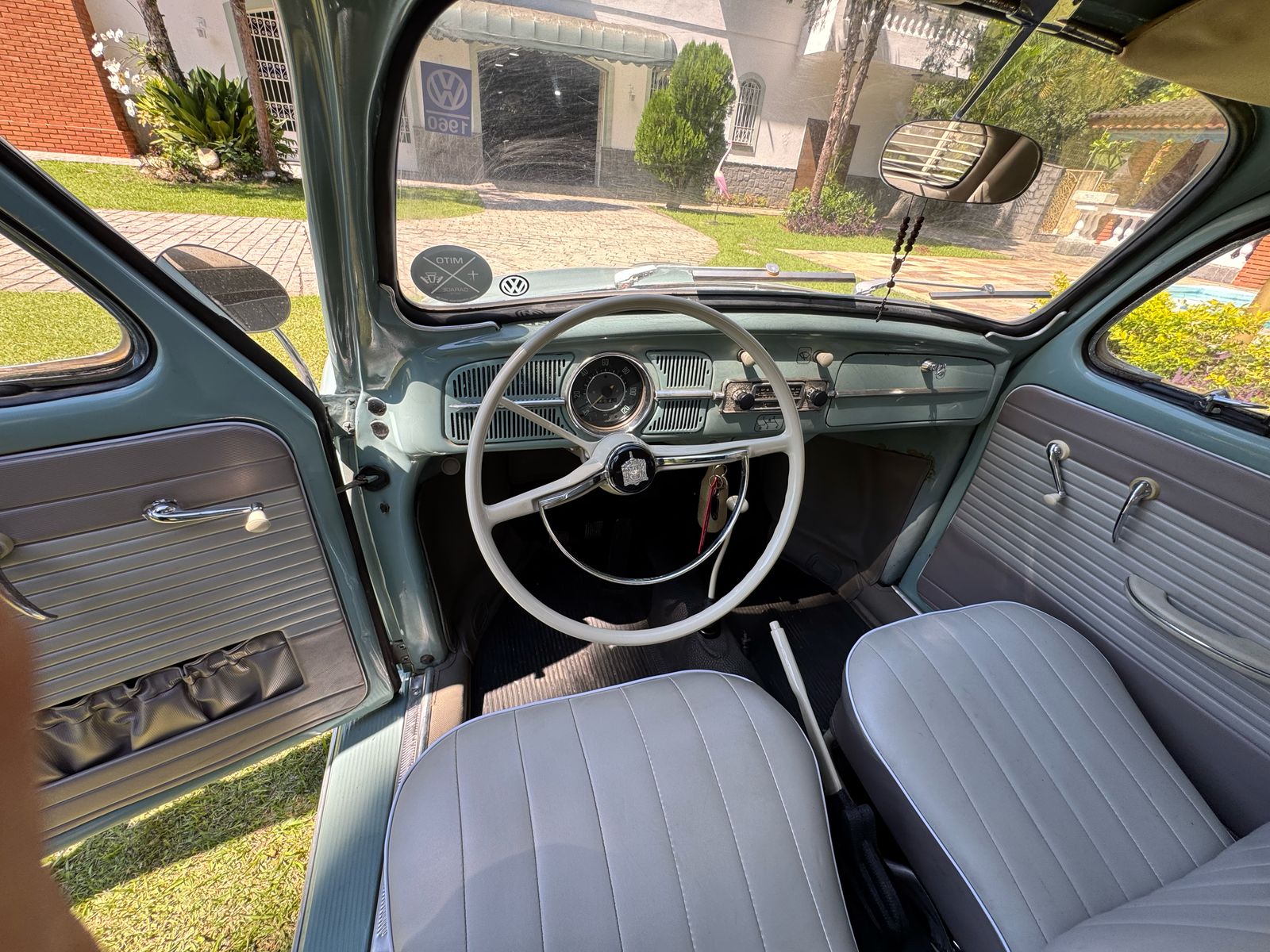 VW Fusca 1960, Azul Pastel, extremamente raro nos dias de hoje, possui setas bananinha de sinalização, jogo de Rodas Fuchs incluindo o estepe, Persianas, farol olho de boi, grades de farol de porsche importadas, parachoques cromados com batente e goleira bicudinha, nariz de bruxa, lanternas pequenas, saia H e frente com 4 Ts, braço suporte tampa do porta malas, tanque alto com régua graduada para medir o combustível, estribos na cor do carro, interior no padrão original com bancos caixotes em dois tons, mamadeira ou saco de bode como esguicho de água e motor 1200 no padrão original.