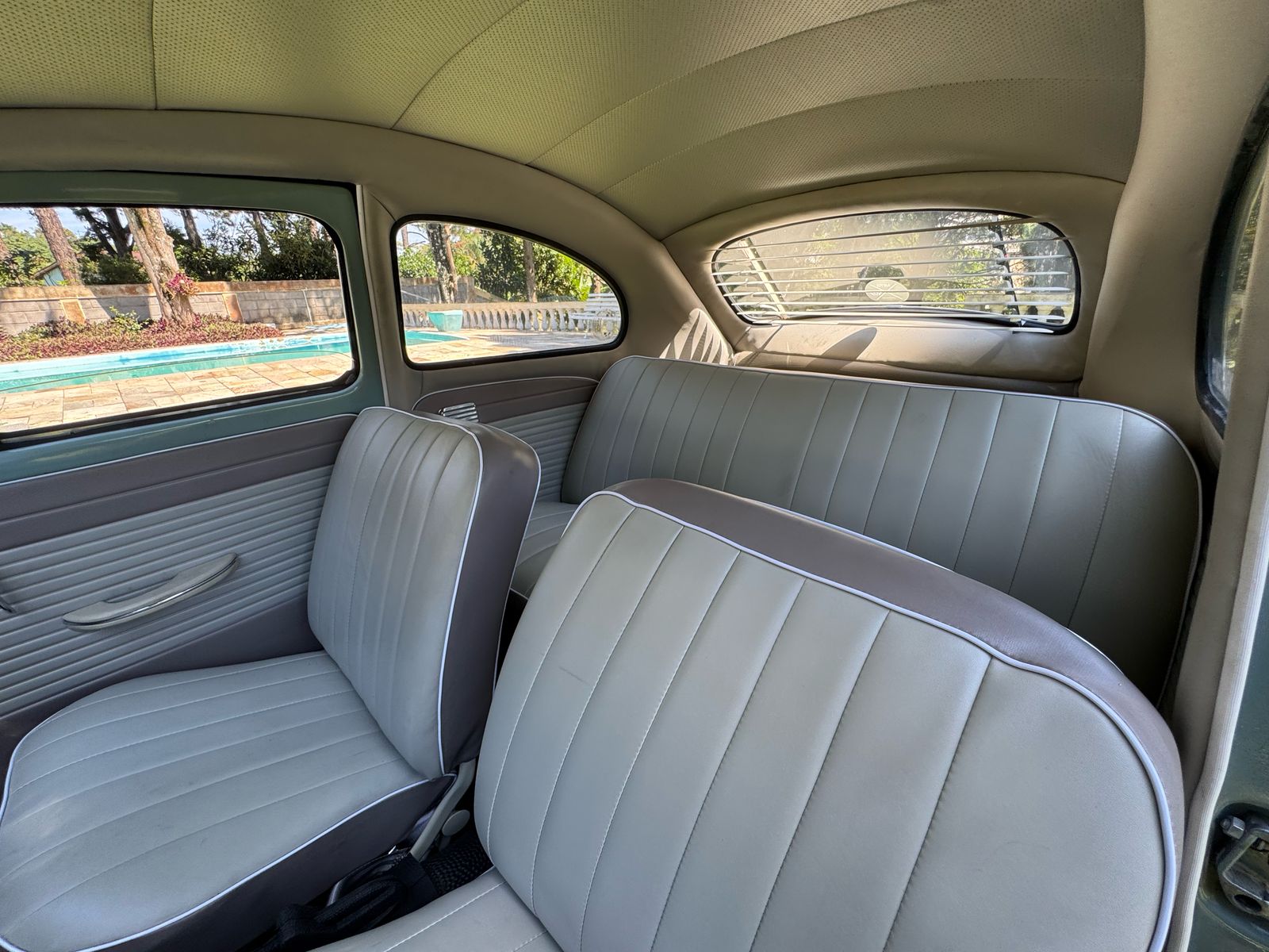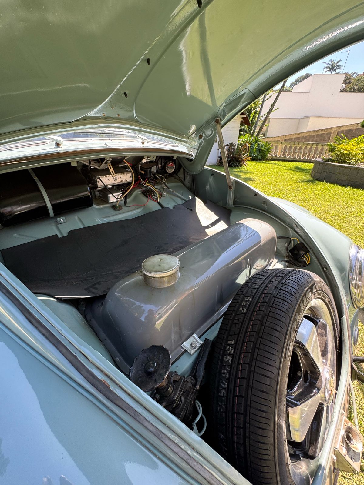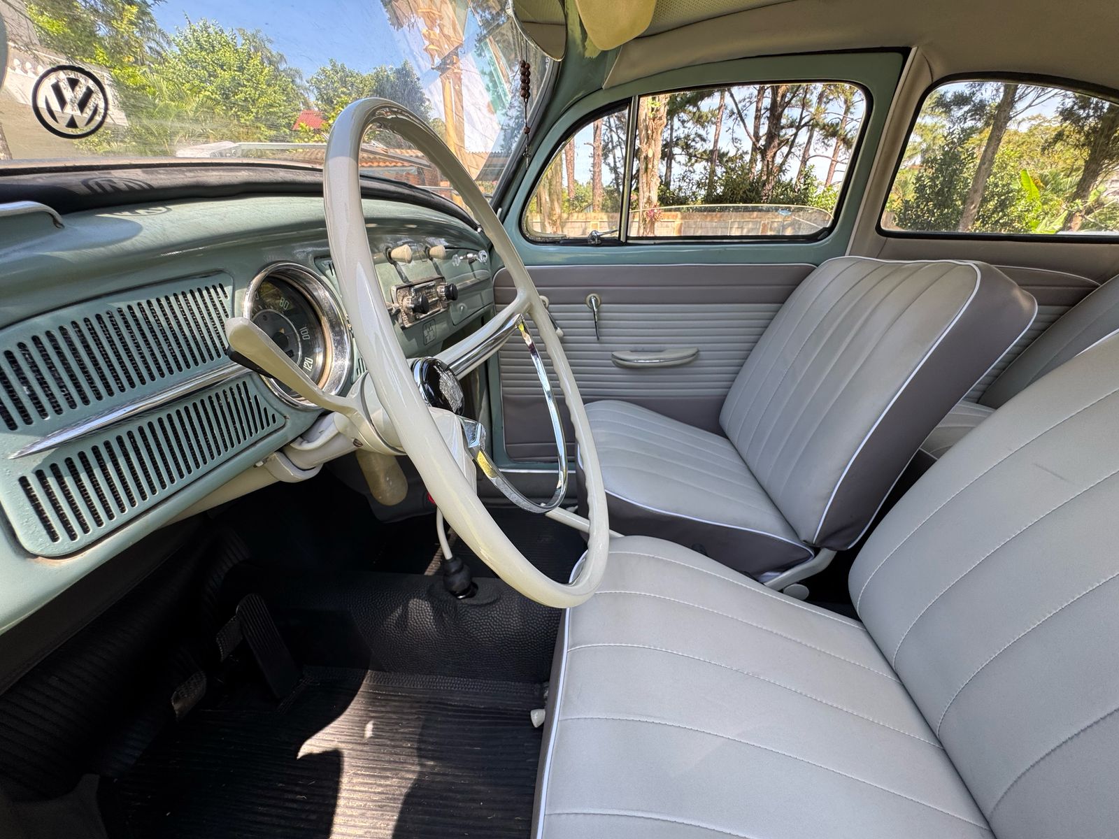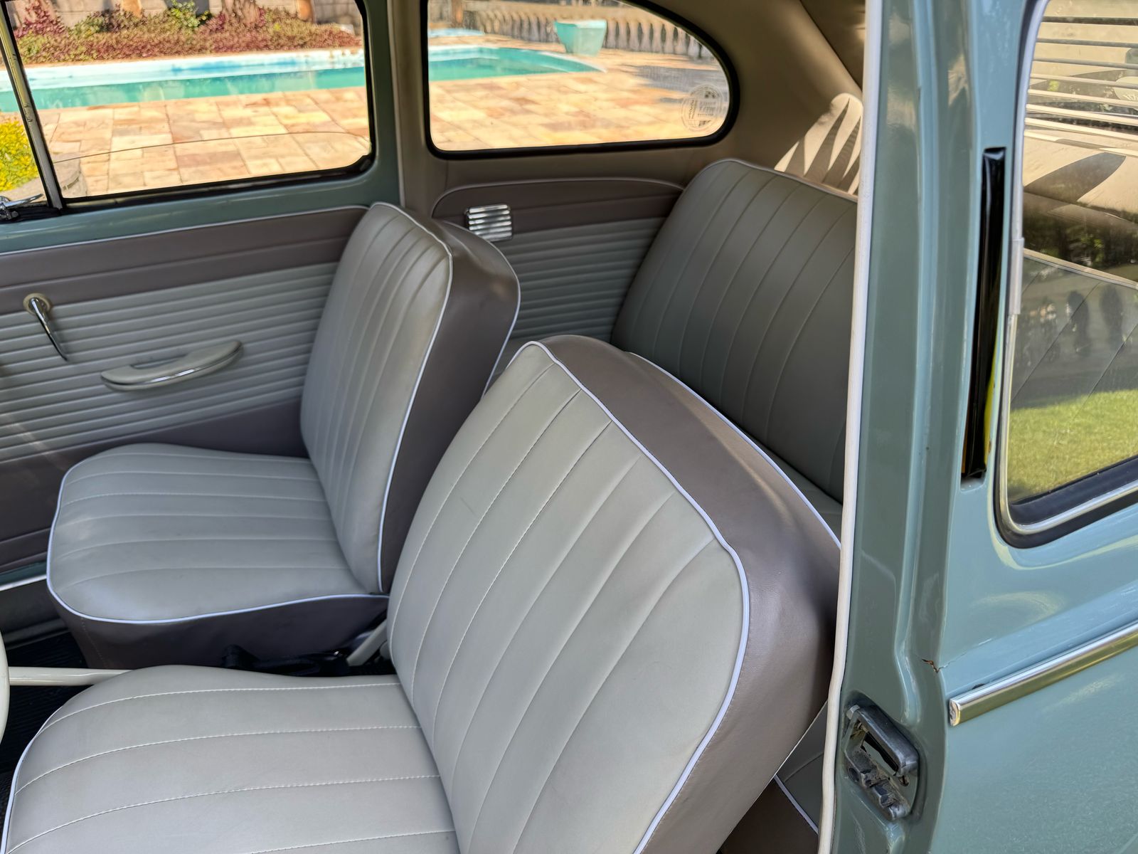 VW Fusca 1960, Azul Pastel, extremamente raro nos dias de hoje, possui setas bananinha de sinalização, jogo de Rodas Fuchs incluindo o estepe, Persianas, farol olho de boi, grades de farol de porsche importadas, parachoques cromados com batente e goleira bicudinha, nariz de bruxa, lanternas pequenas, saia H e frente com 4 Ts, braço suporte tampa do porta malas, tanque alto com régua graduada para medir o combustível, estribos na cor do carro, interior no padrão original com bancos caixotes em dois tons, mamadeira ou saco de bode como esguicho de água e motor 1200 no padrão original.