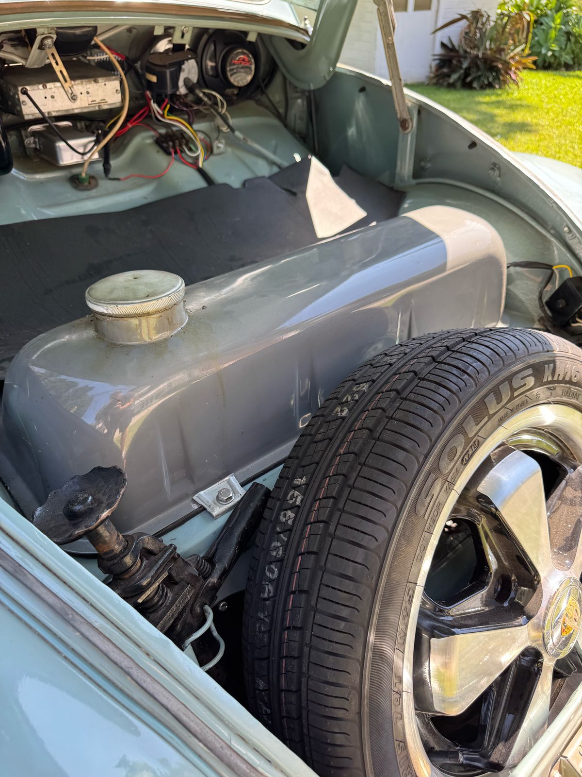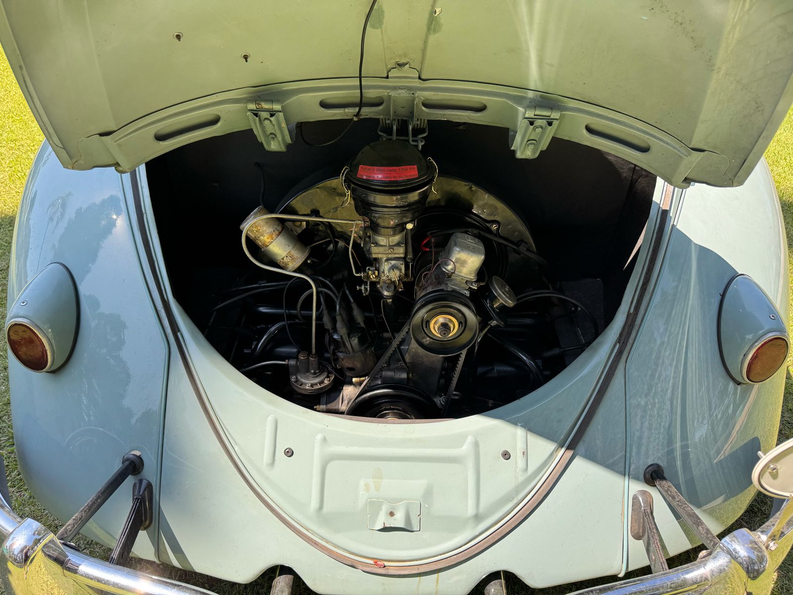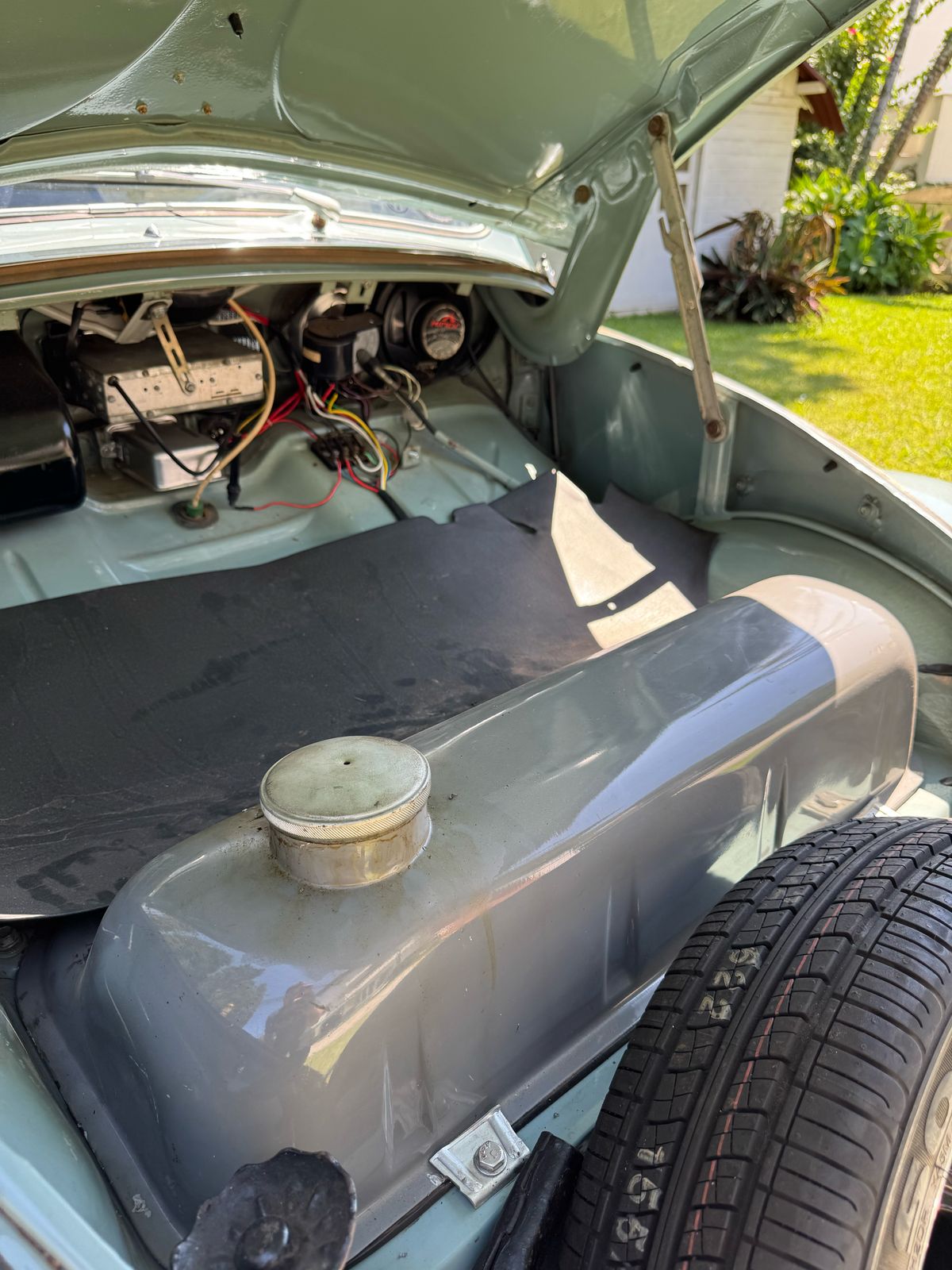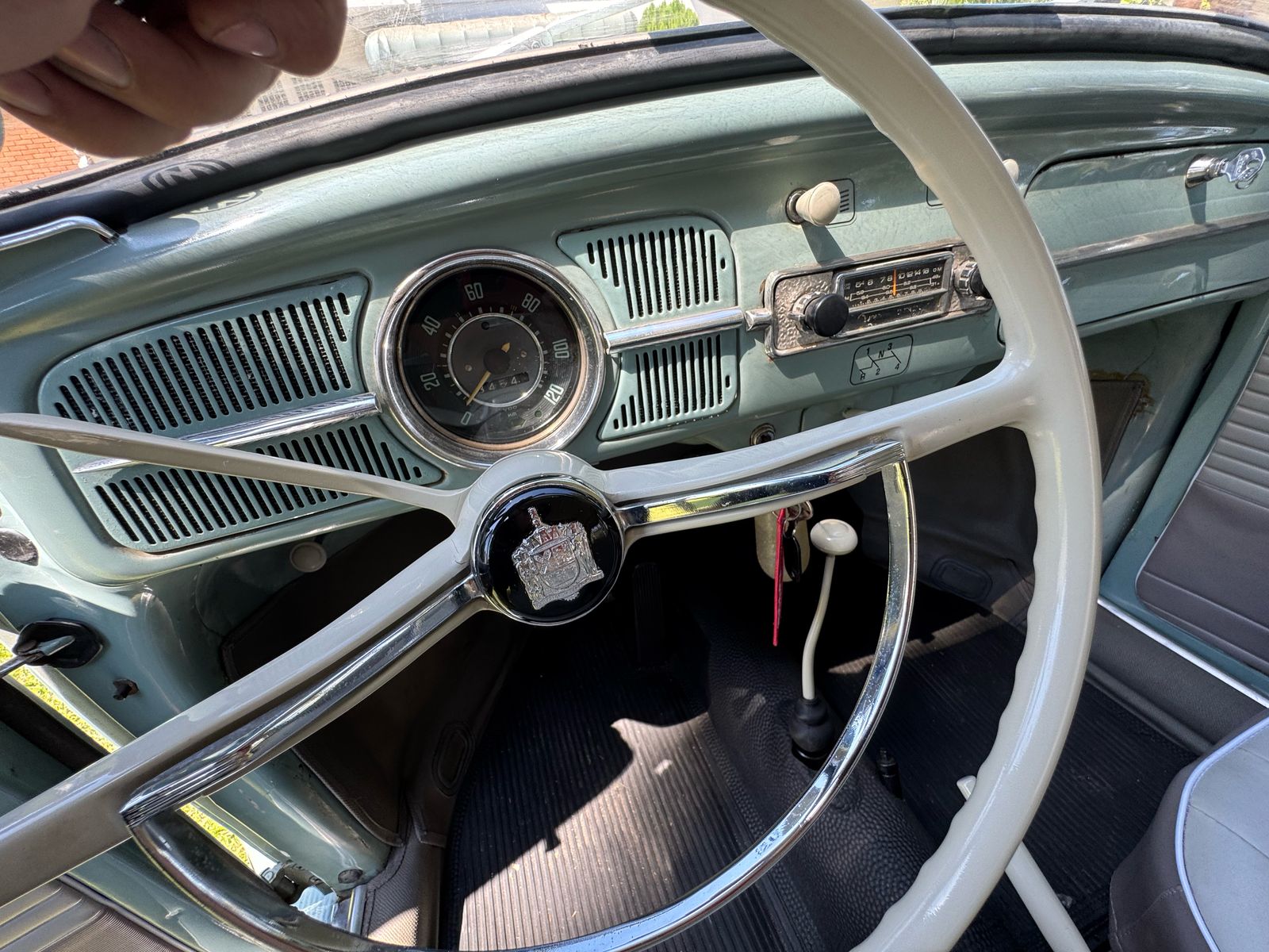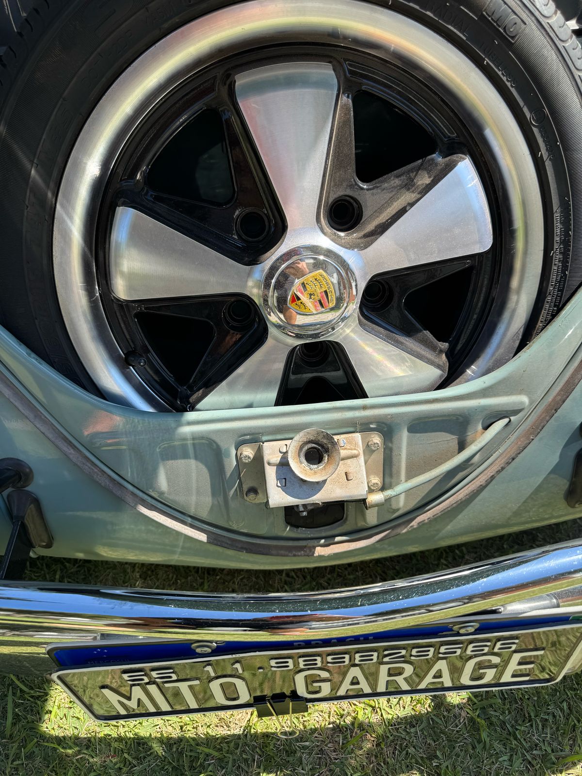 VW Fusca 1960, Azul Pastel, extremamente raro nos dias de hoje, possui setas bananinha de sinalização, jogo de Rodas Fuchs incluindo o estepe, Persianas, farol olho de boi, grades de farol de porsche importadas, parachoques cromados com batente e goleira bicudinha, nariz de bruxa, lanternas pequenas, saia H e frente com 4 Ts, braço suporte tampa do porta malas, tanque alto com régua graduada para medir o combustível, estribos na cor do carro, interior no padrão original com bancos caixotes em dois tons, mamadeira ou saco de bode como esguicho de água e motor 1200 no padrão original.