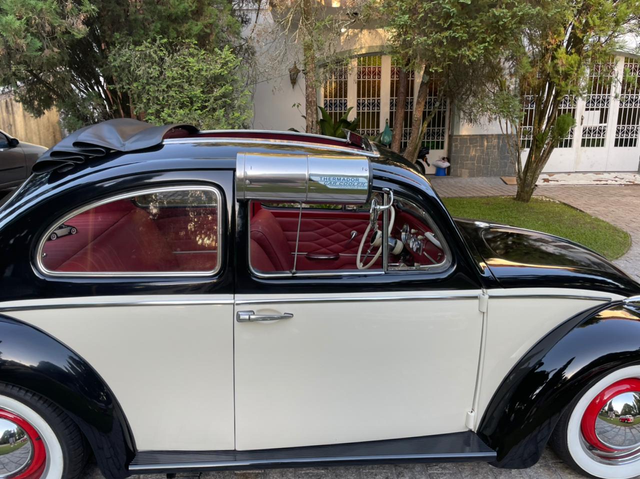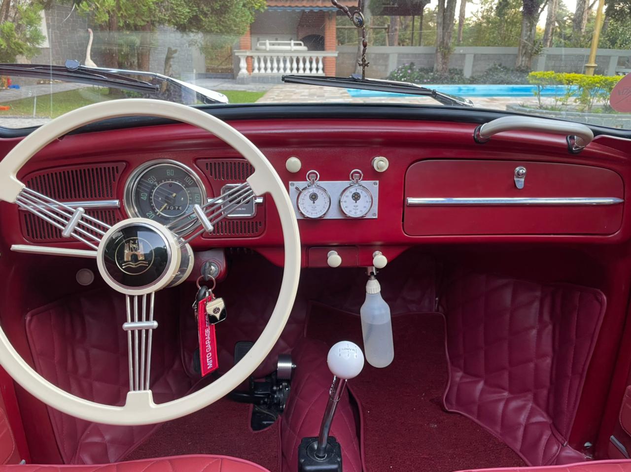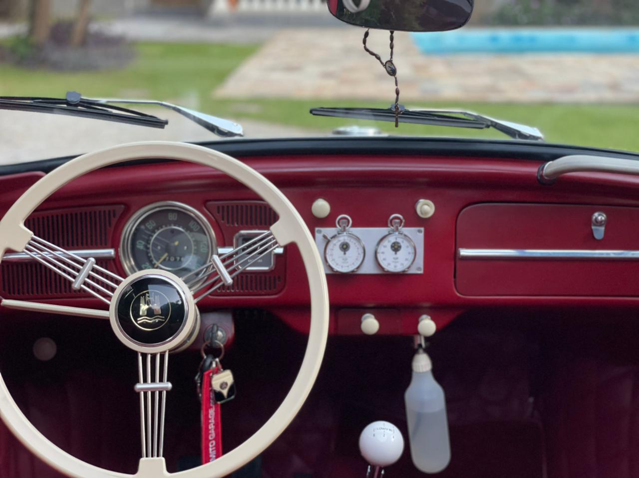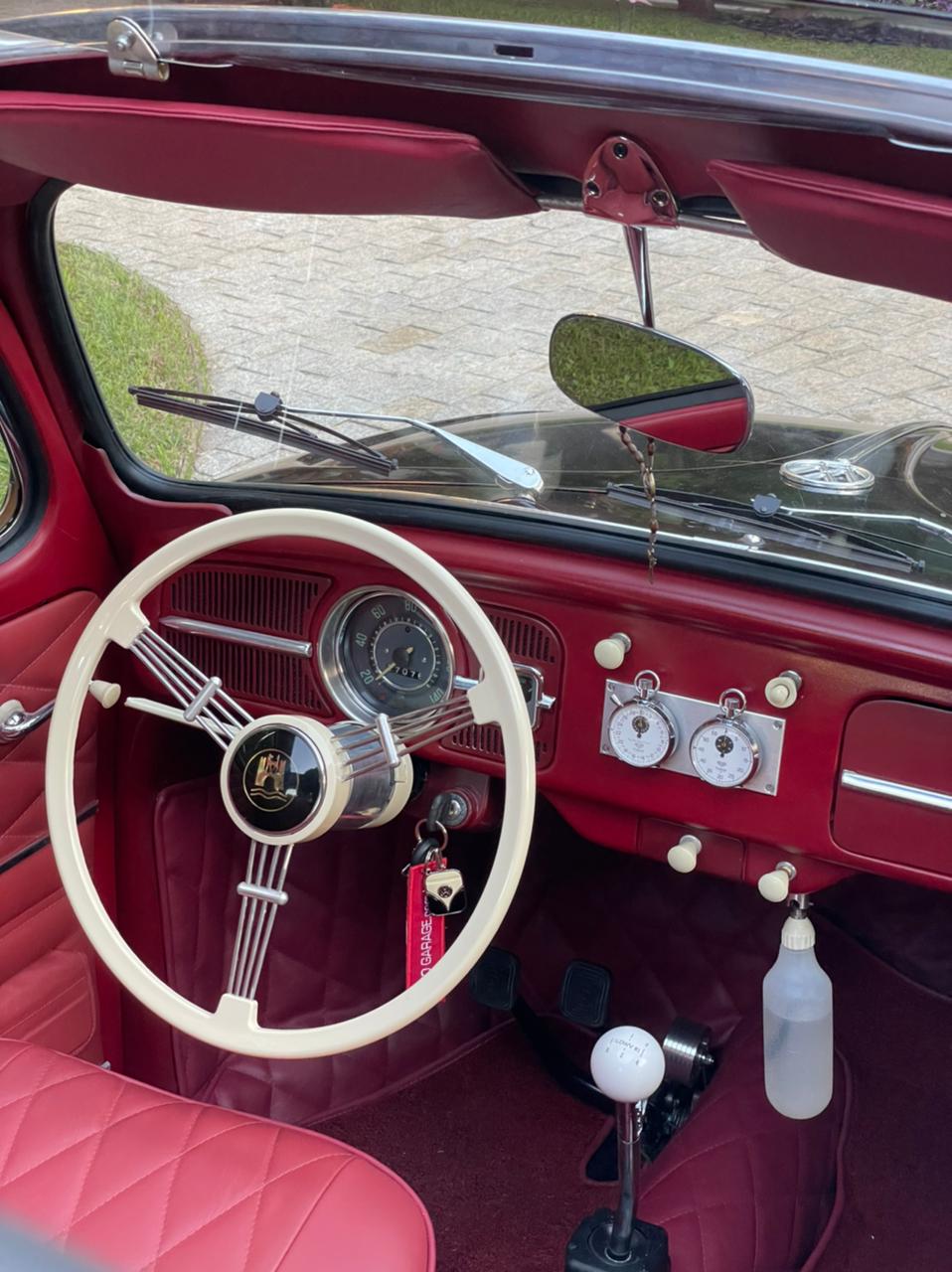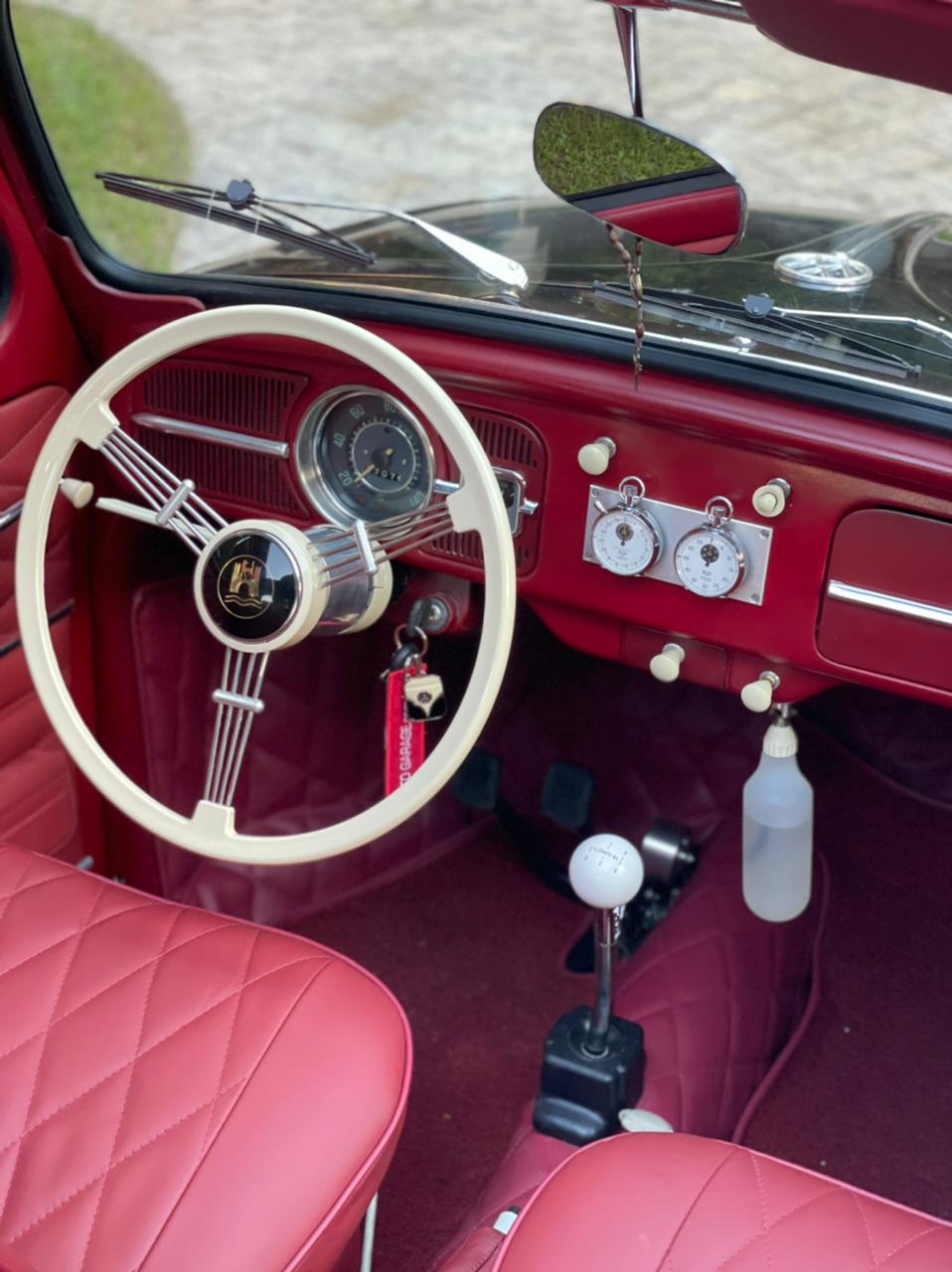 VW Fusca 1968, Pintado em 3 cores, Preto, Branco e Vermelho, Kustomizado by Victor Galli, carro exclusivíssimo com muitos acessórios raros, Ragtop, estribos Empi, possui lentes originais de porsche 356, Ragtop, Volante Banjo Empi com Botão de buzina wolfsburg, Antena Truffi, Ar Condicionado de época em inox acima da porta do passageiro, dois relógios Tag Heuer originais para tomada de tempo no painel, pedal Roller, Interior em couro legítimo na cor vermelha, exclusivo, desenhado a mão e executado com primazia, Rodas Aro 15″encomendadas na Rodabras para ser vermelha e cromada, com pneus faixa branca, parachoques cromados com batentes e puleiro, protetor dianteiro e traseiro de parachoques, buzina Hella exposta, Retrovisores estilo HotRod, motor customizado e escapamento maf em inox.